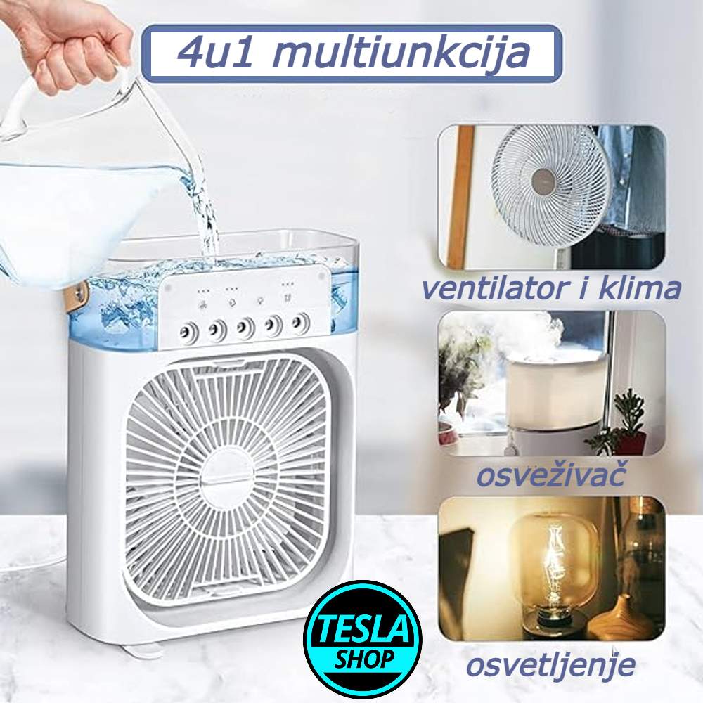 Ovaj ventilator vazdušnog hladnjaka nije običan – on kombinuje funkciju standardnog ventilatora sa svojstvima ovlaživača vazduha, aroma difuzora i LED noćnog svetla. Sa 3 brzine ventilatora, 3 režima ovlaživanja i mogućnošću dodavanja eteričnih ulja, ovo je multifunkcionalno čudo.