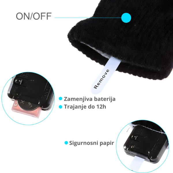 Svaka rukavica koristi zamenjivu bateriju koja može trajati do 12 sati ⏰. Jednostavno otvorite čičak traku sakrivenu na zglobu rukavice, izvucite belu traku i zamenite bateriju. Svaka rukavica dolazi sa zaštitnom izolacionom trakom u odeljku za bateriju - izvadite je pre upotrebe i vratite nakon upotrebe kako biste produžili vek baterije.