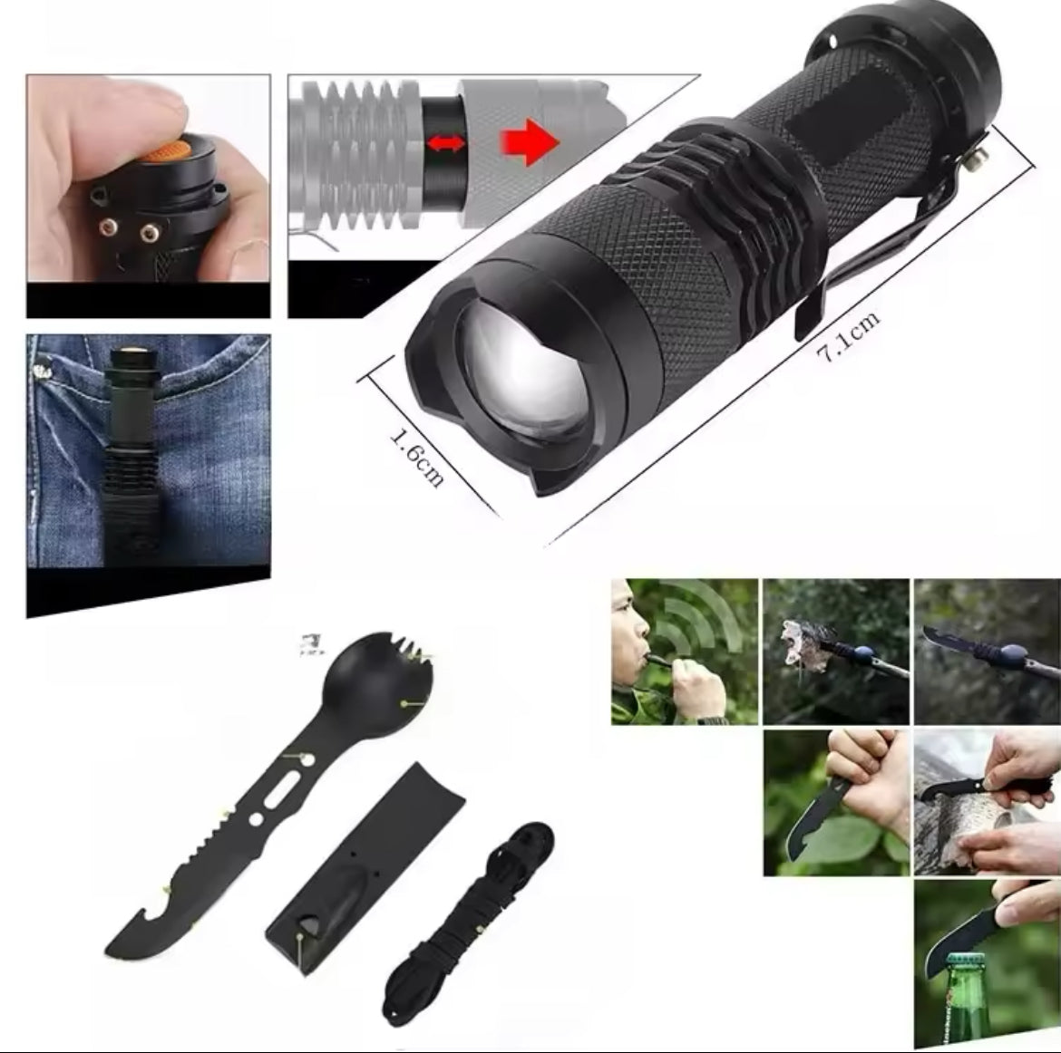 Kompaktna taktička lampa osvetliće vam put čak i u najtamnijim noćima, dok će rasklopivi nož od inoks čelika biti vaš verni saputnik za sečenje i pripremu hrane.