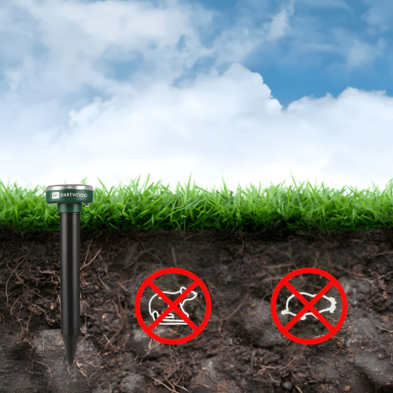 Kada se postavi u zemlju, emituje pulsirajuće zvučne vibracije koje ometaju krtice i teraju ih dalje od vašeg vrta.